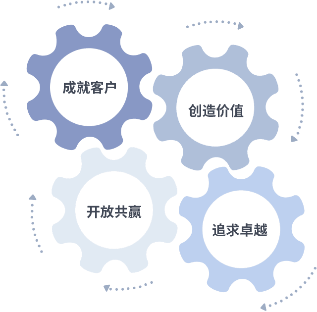 成就客户是一切决策的出发点,,创造价值是衡量所有工作的标准,,,,追求卓越是我们做事做人的态度,,,,开放共赢是我们的格局也是最终的结果。。。价值观的齿轮环环相扣,,,,推动着组织里的每个人不断向前。。。